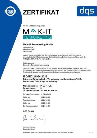 Willkommen bei der MAK-IT Remarketing GmbH, Ihrem spezialisierten Partner für IT-Remarketing in Deutschland und Europaweit. Wir bieten umfassende Lösungen für den IT-Ankauf und IT-Verkauf, von der sicheren Datenlöschungbis zur nachhaltigen Verwertung von Laptops, Computern, Druckern, Monitoren und Datenträgern. Unsere Dienstleistungen sind nach ISO 27001 zertifiziert und garantieren höchste Sicherheit und Professionalität. Unsere Datenträgervernichtung entspricht dem Standardder ISO 21964. Vertrauen Sie auf unsere Expertise im B2B-Bereich und profitieren Sie von unseren maßgeschneiderten Lösungen in Deutschland und Europaweit.